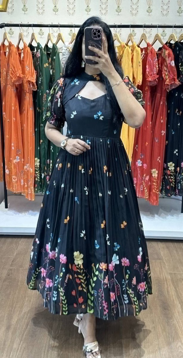 These beautiful floral pleated dress featuring vibrant floral prints. The design starts with scattered small flowers on the bodice and upper skirt, gradually transitioning into a dense, colorful garden border near the hem with shades of pink, yellow, red, blue, and green. The dress has short ruffled sleeves with matching floral patterns giving it a modern touch. The pleated skirt adds graceful movement, while the floral motifs bring a cheerful, feminine vibe.