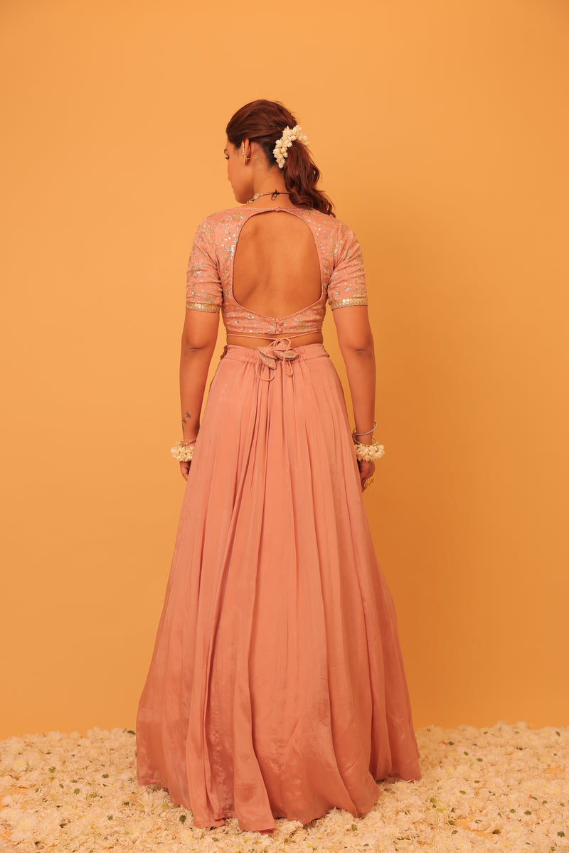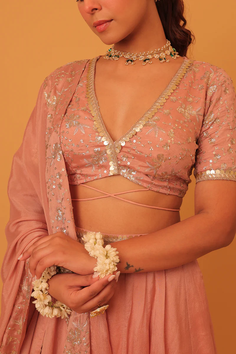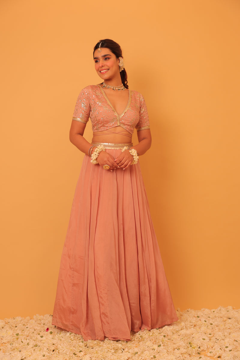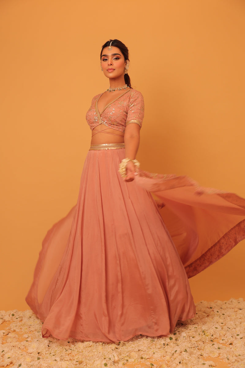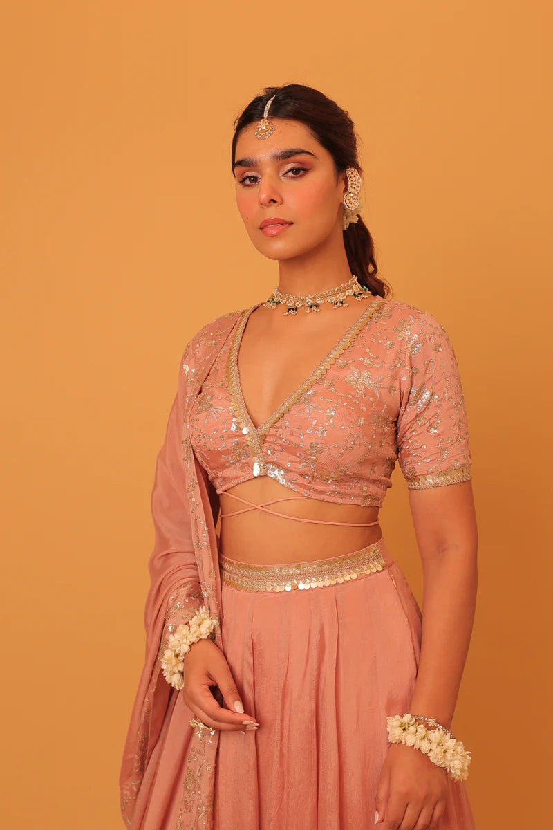 Grace meets grandeur in this exquisite dusty rose lehenga set, beautifully crafted from luxurious Chinnon silk. Designed to create a mesmerizing silhouette, the 3+ meter box-pleated flare flows with elegance, giving you a regal presence with every step.